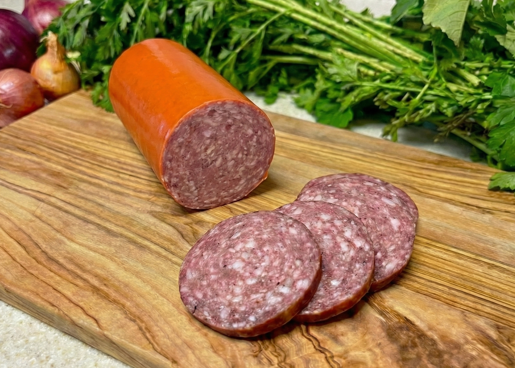 Beef Uncured Summer Sausage on a wooden cutting board with fresh herbs and onions in the background. A picture of summer sausage with slices cut out, showing the pink, marbled interior typical of fully-cooked sausage.